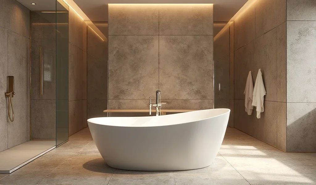 Großformatige Fliesen sorgen für ein modernes, ruhiges Raumgefühl und verleihen dem Bad eine luxuriöse Optik. Weniger Fugen, klare Linien und hochwertige Materialien schaffen ein edles Wellness-Ambiente.